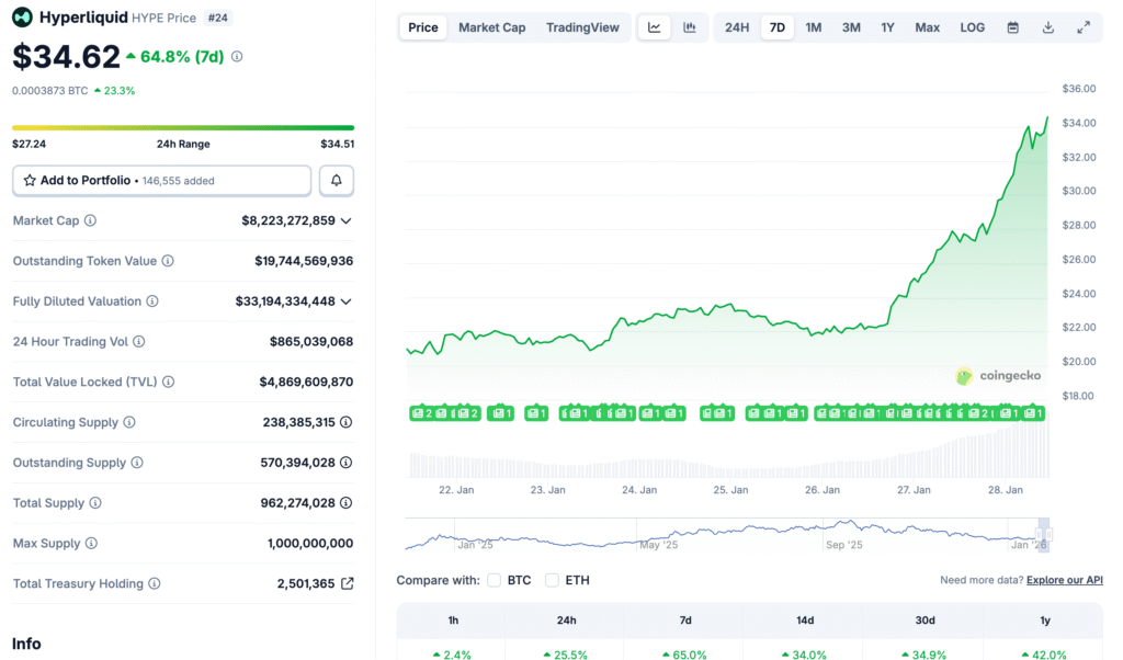 Údaje z trhov BeInCrypto ukázali, že HYPE má od pondelka rastúcu tendenciu. Altcoin dnes ráno prudko vzrástol na 34 $, čo predstavuje jeho najvyššiu cenu od začiatku decembra.