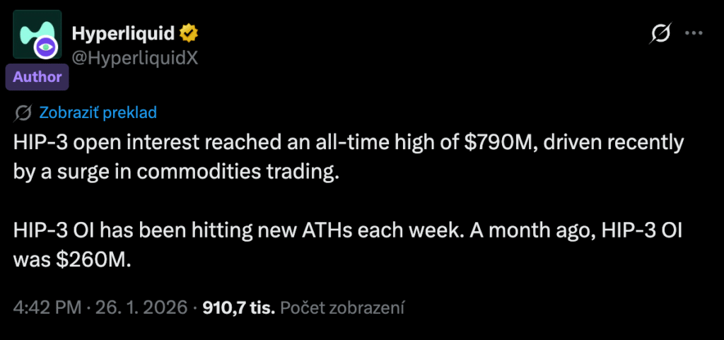 „Open Interest na HIP-3 dosahuje nové historické maximá každý týždeň. Pred mesiacom to bolo 260 miliónov $,“ uviedol Hyperliquid.
