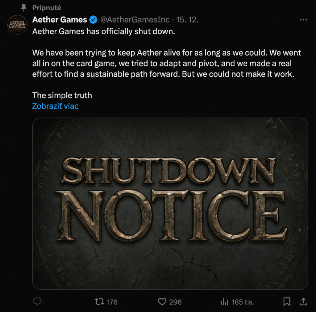 Najnovším a najhlasnejším príkladom je pád štúdia Aether Games. Tento príbeh nie je len o zlom manažmente jedného tímu; je ilustráciou toxického ekosystému, v ktorom nastavenie incentív a distribúcie hodnoty v praxi vedie k tomu, že skorí aktéri realizujú zisky na úkor neskorších hráčov a investorov.